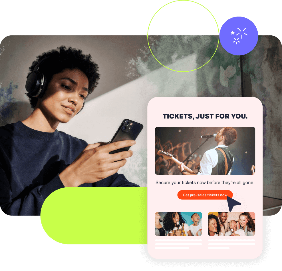 Get visibility into your customers’ interests with a comprehensive view of their interactions with your brand, preferences, consent, and intent in real time. Use the drag-and-drop canvas to build campaigns that trigger automatically from high-intent actions, like signing up for a subscription or booking tickets. Add delays or exclusions, so messages always land at the right moment, and quickly identify and fix technical issues that could disrupt the fan experience.